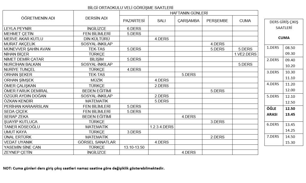 Öğretmenlerimizle daha verimli görüşme yapabilmeniz için Öğretmen-Veli Görüşme Saatleri Çizelgesi oluşturulmuştur. Çizelgede belirtilen gün ve saatlerde öğretmenlerimizle görüşebilirsiniz.
